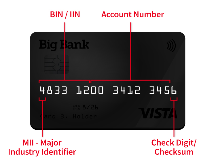 An ISO/IEC 7812 number is up to 19 digits in length and used the following format A BBBBB CCCCCCCCCCCC where A BBBBB denote the Bank Identification Numbers ("BIN") or Issuer identification number ("IIN") A (Single Digit) specify the Major Industry Identifier (MII). BBBBB (5 Digits) specify the issuing institution or bank. CCCCCCCCCCCC (up to 12 digits) specify the individual account identifier. D (Single Digit) specify the checksum for validation.